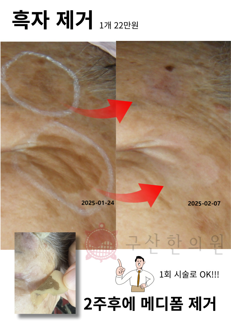 구산한의원에서는 흑자의 색소만을 정확히 선택적으로 제거하는 레이저를 활용하여 1회 시술만으로 제거 합니다.